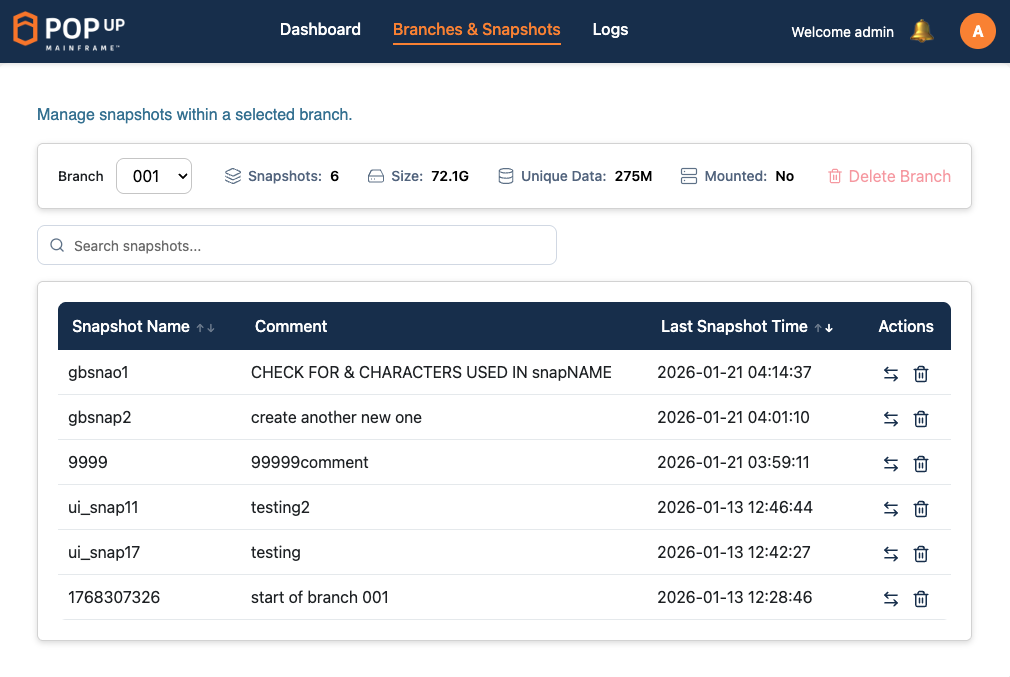 The FastTrack UI Branches and Snapshots page shows a full searchable list of all snapshots and branches, enabling the user to switch to, or delete, any snapshot with just a click.
